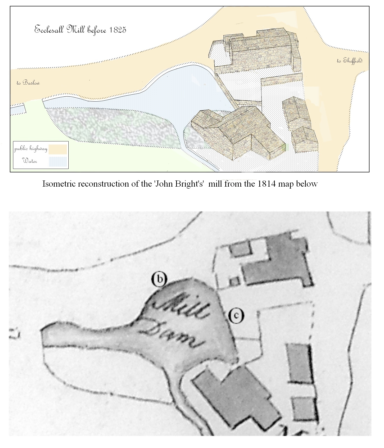 The site stood at the crossroads formed by the Sheffield Baslow turnpike and Millhouses Lane, which ran right alongside some of the mill buildings, for there was, as then, no Archer Road. As can be seen from the map, the main road widened as it passed the mill, forming the equivalent of the traditional village green, so the buildings with its pond would have formed the focal point of the hamlet.